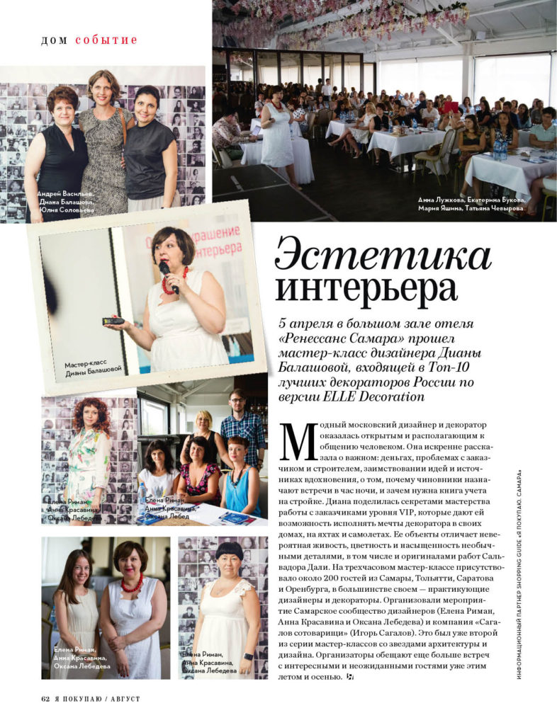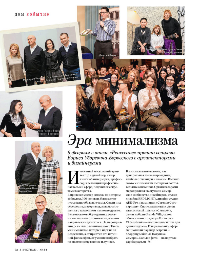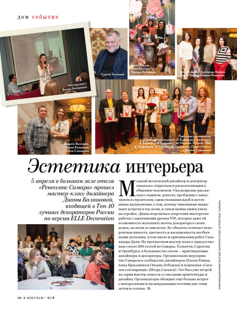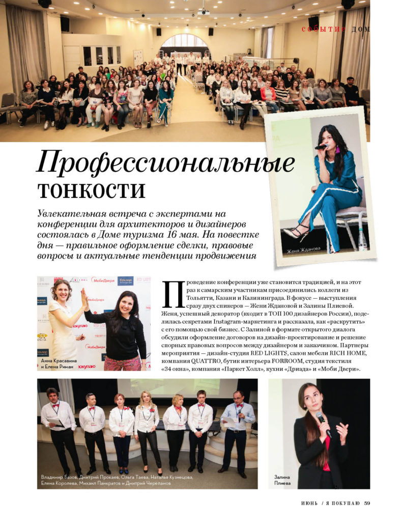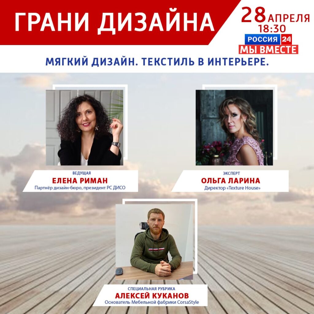 События Телевидение Участие в ТВ-программах на «Россия 24» в качестве сценариста и ведущего эксперта: более 15 программ Радио «Стиль в большом городе» на радио Маяк Самара о ремонте, строительстве и дизайне Выставки Посещение выставок в России и Европе I Saloni, Милан 2012 I Saloni, Милан 2013 BAU, Мюнхен 2011 IMM COLOGNE, Кельн 2011 INTERIOROOM, ежегодно DUTCH DESIGN WEEK, Eindhoven 2017 SALONI, Москва СМИ и журналы Публикации в российских и зарубежных СМИ Интервью Интервью для журнала «Собака» Интервью для журнала «Я покупаю» Мероприятия Организация мероприятий с: Женей Ждановой Ольгой Косыревой Дианой Балашовой Борисом Уборевичем-Боровским Соорганизатор фестиваля «Dom Fest» 2023 и 2024